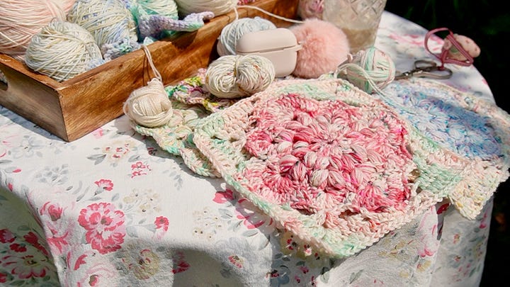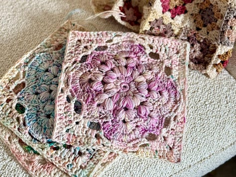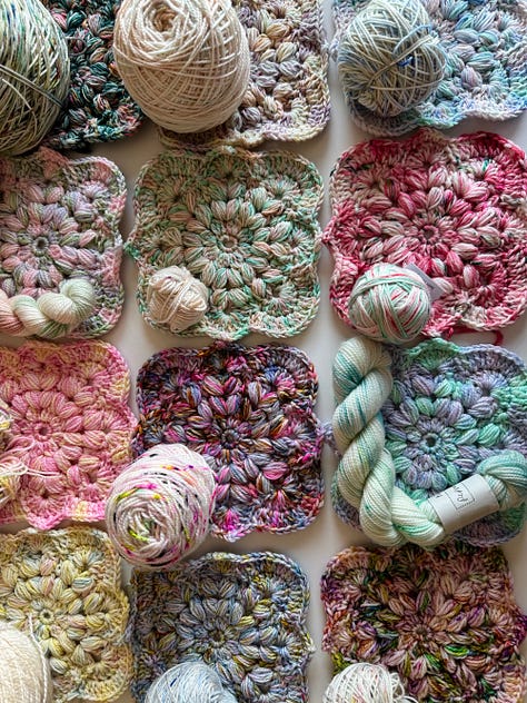 Armed with a motif I liked, I set about pulling out some of my favourite 4ply left-overs and random minis and happily settled into working up motifs. (I have a little video I made of me enjoying this part.)